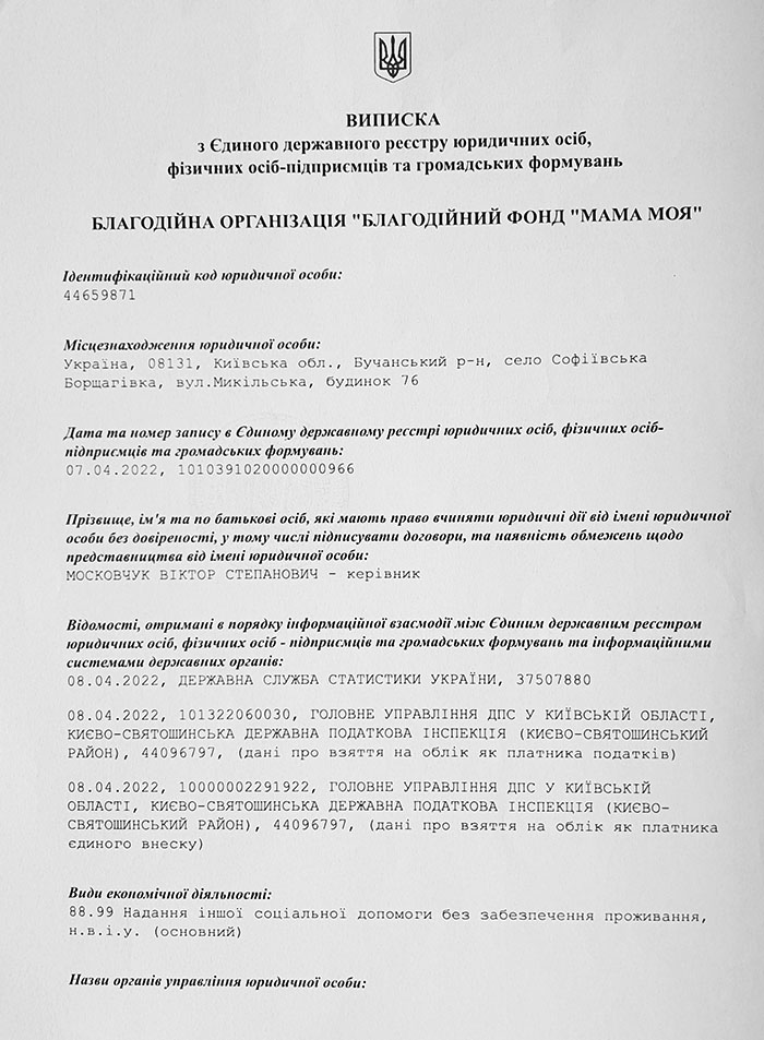 За підтримки української сторони, під час війни в Україні, була заснована неприбуткова Благодійна Організація Благодійний Фонд "Мама Моя" і зареєстрована 07.04.2022 року за законами України, Бучанський район Київської області.
